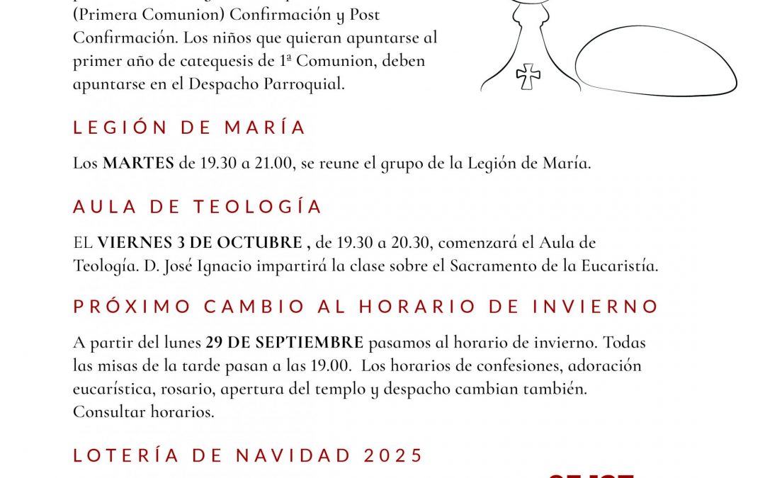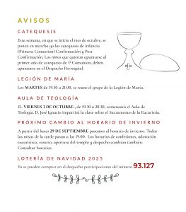 1192 HOJA PARROQUIAL7 por Elena | Sep 26, 2025 | 0 Comentarios Enviar comentario Cancelar la respuestaTu dirección de correo electrónico no será publicada. Los campos obligatorios están marcados con *Comentario * Nombre * Correo electrónico * Web Guarda mi nombre, correo electrónico y web en este navegador para la próxima vez que comente.