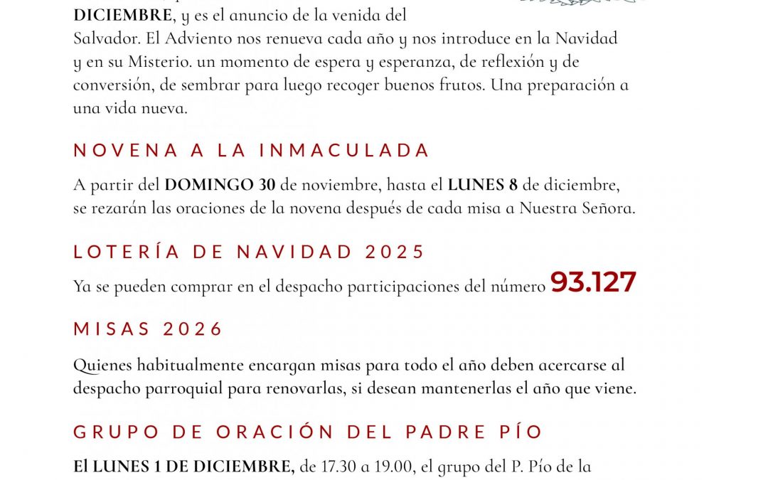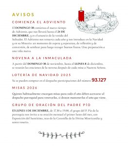 1201 HOJA PARROQUIAL7 por Elena | Nov 28, 2025 | 0 Comentarios Enviar comentario Cancelar la respuestaTu dirección de correo electrónico no será publicada. Los campos obligatorios están marcados con *Comentario * Nombre * Correo electrónico * Web Guarda mi nombre, correo electrónico y web en este navegador para la próxima vez que comente.